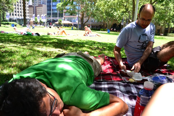 Começámos uma mini sessão de yôga na praia e qual a nossa surpresa quando se junta a nós um senhor que parecia indiano, mas ficámos sem saber donde era. Figura bastante atlética e possante para um homem dos seus 60 anos de idade e começou a fazer ásanas connosco na praia e a querer aprender. Em inglês começámos a dar uma mini-aula de yôga e a explicar os movimentos e posições passo-a-passo com a respiração correcta. Puxámos-lhe pelo físico e ele adorou. Entretanto já tinhamos uma mini plateia de americanos na praia de olho em nós e a pressionar-nos para não nos estatelarmos…